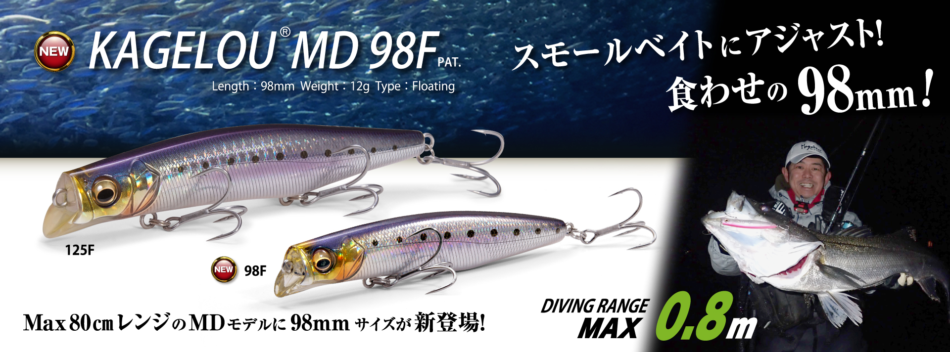 KAGELOU MD 98Fは、さらなるレンジ展開を広げる、ジュニアサイズのカゲロウ・ミッドダイブモデル。シャロー域や表層域において、イナッコ、カタクチなどの小型ベイトをシーバスが捕食しているシチュエーションにアジャスト。 独自のスポイラービルは、捕食レンジにシビアなモンスターを果敢に反応させるため、最大0.8mの絶妙なフィーディングレンジを捉えます。