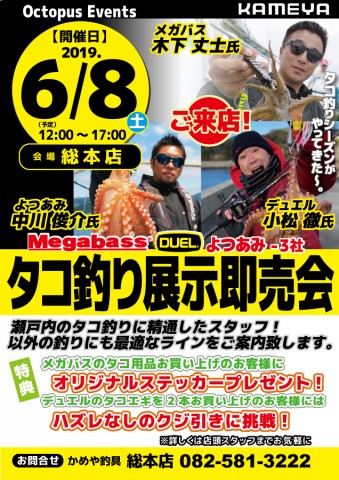 6月8日(土)12時~、広島県広島市のかめや釣具総本店にて3社合同イベント「タコ釣り展示即売会」開催致します!