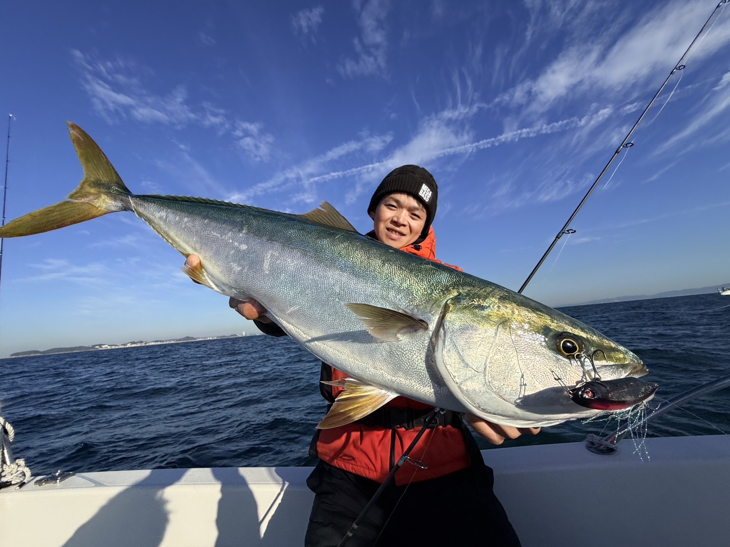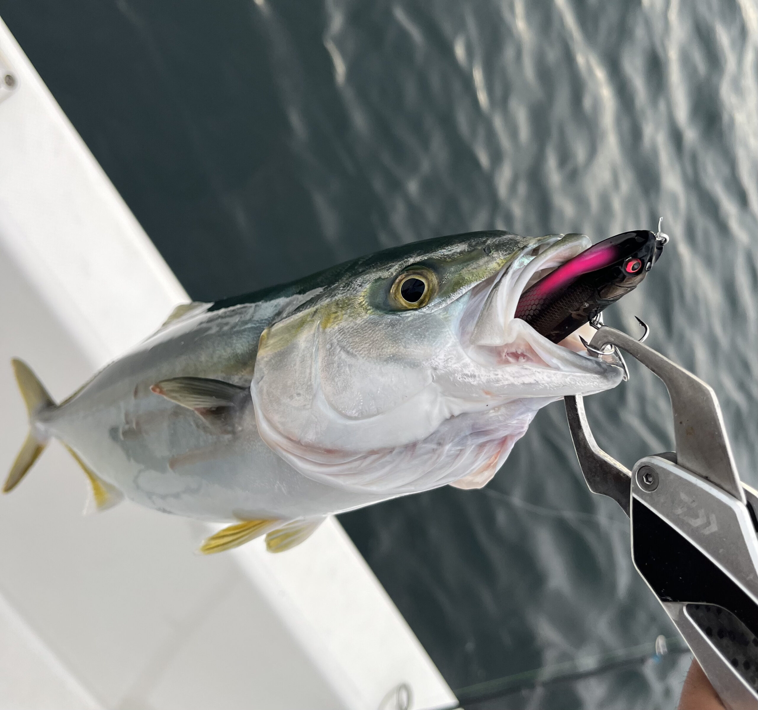 しっかり重さが乗ってからフッキングし、慎重にファイトして上がってきたのは60cm前後のハマチ!