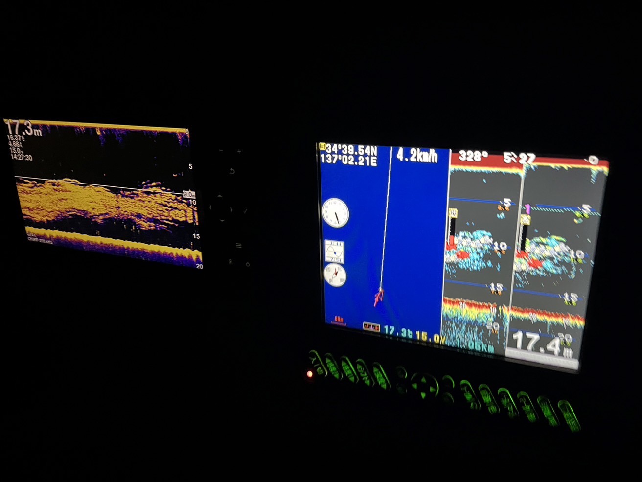 この日は青物狙いで朝3時に出船し、魚探の反応を見ながらベイトが濃く集まるエリアを探しました。