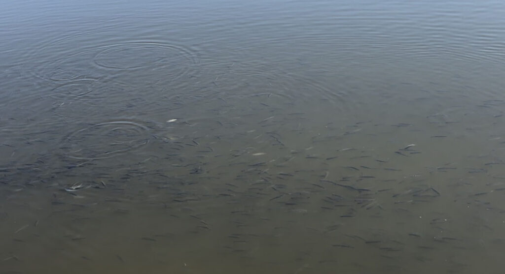 訪れた日の3日前から寒波が入り込んでいたので、「冬っぽい雰囲気になっているかな~」と思いきや、水面にはベイトが目視できる状況で、まだ完全には冬に移行していない状況でした。