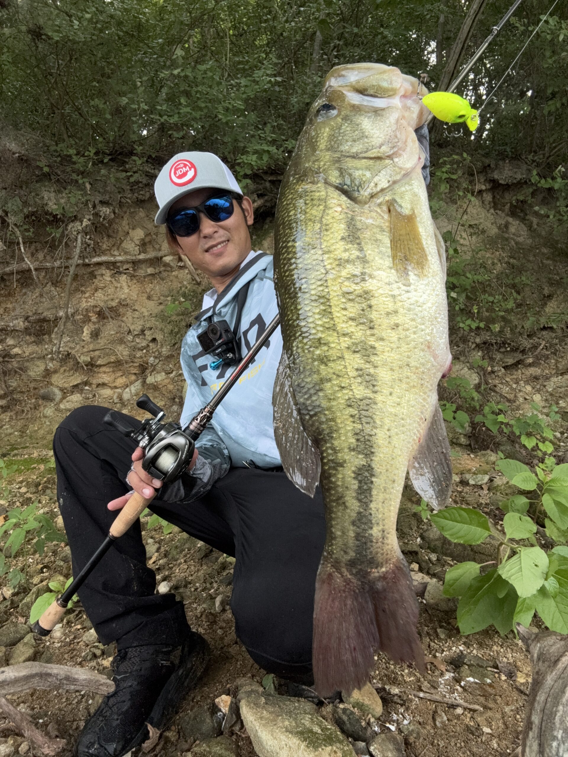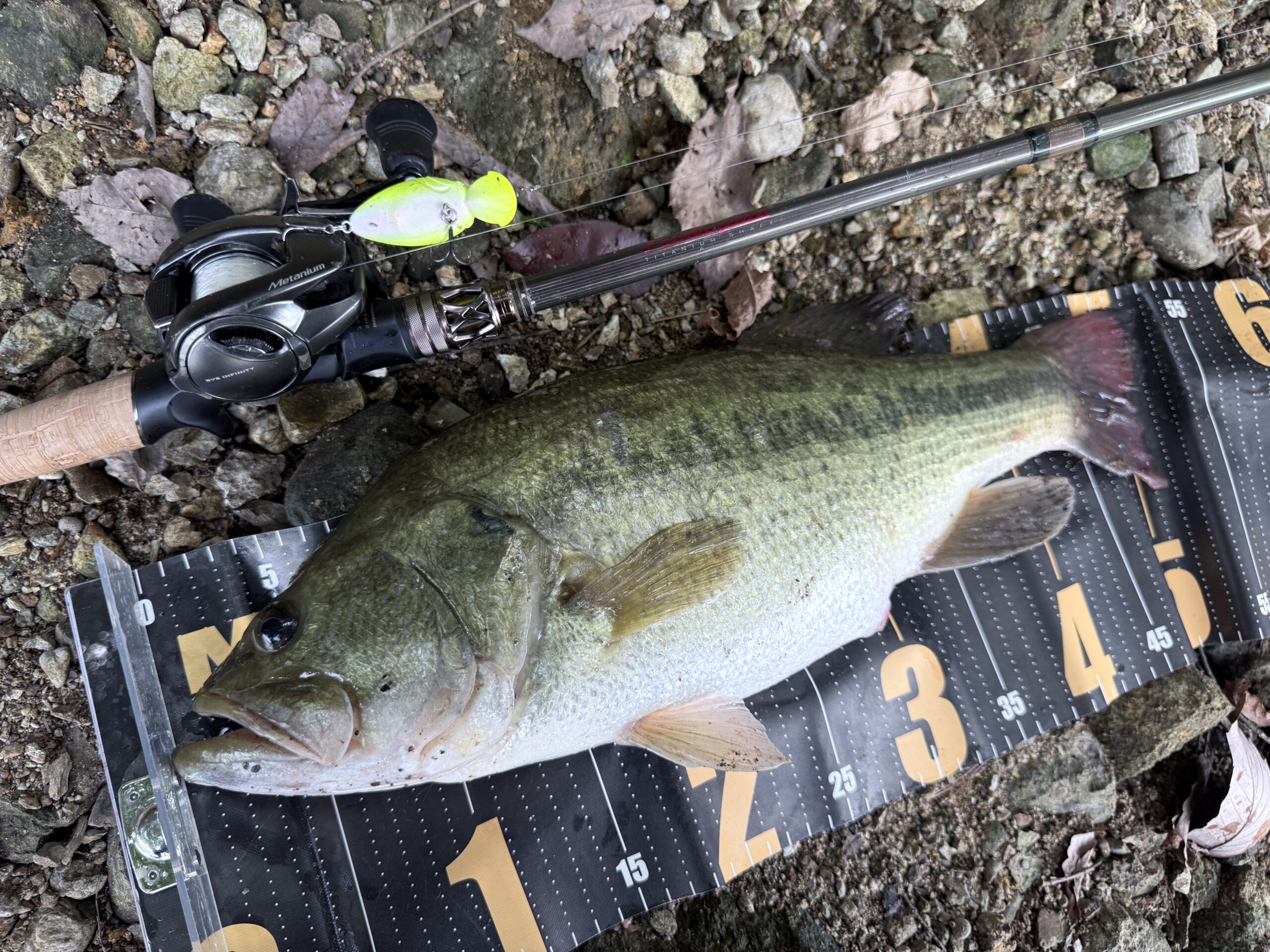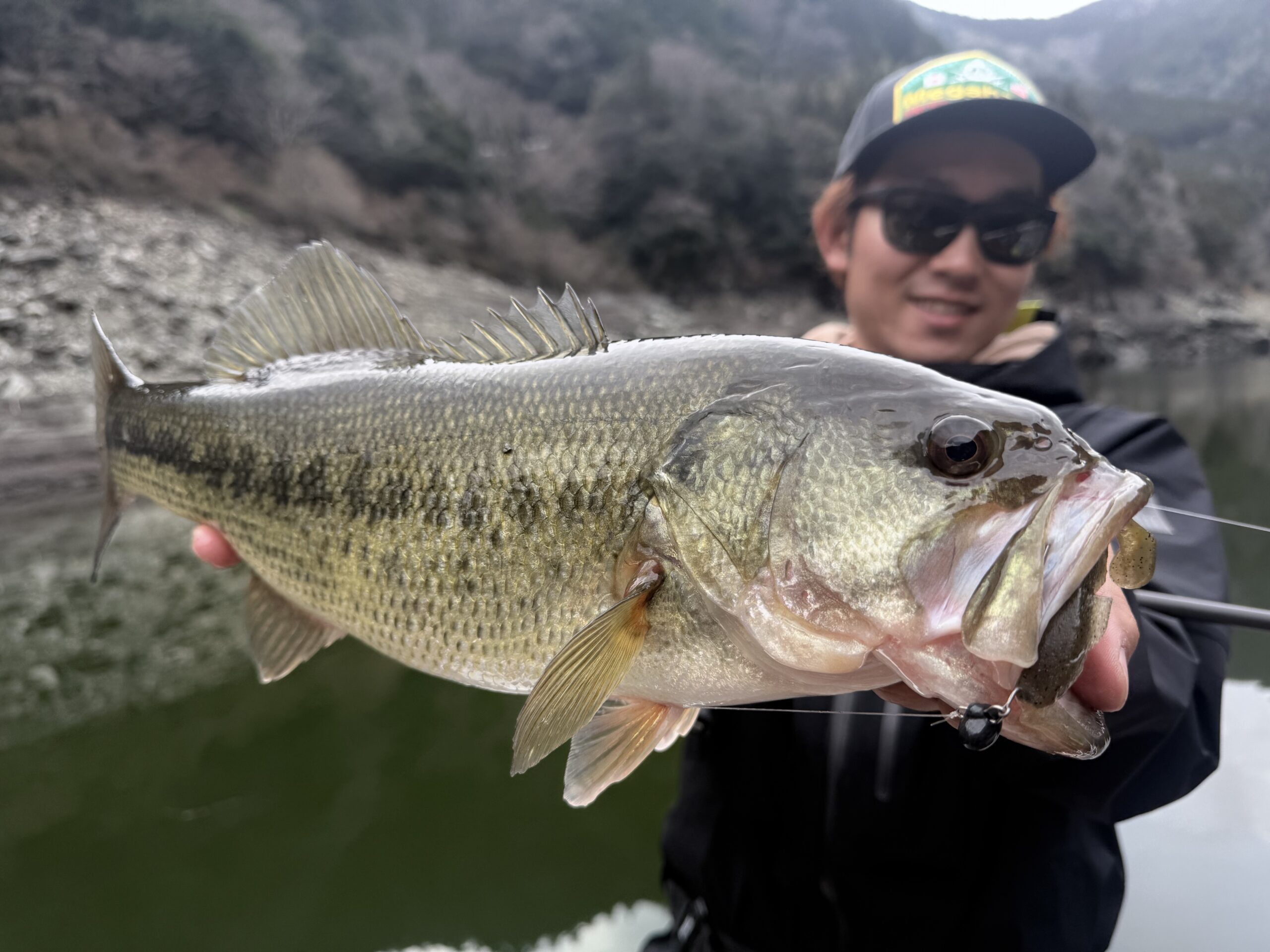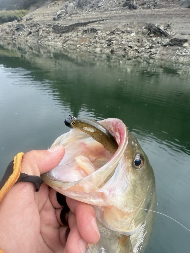 減水した野池や流入河川など、岩や倒木などのストラクチャーに軽くコンタクトさせながら巻いてくると、リアクションでバイトを誘発できます。