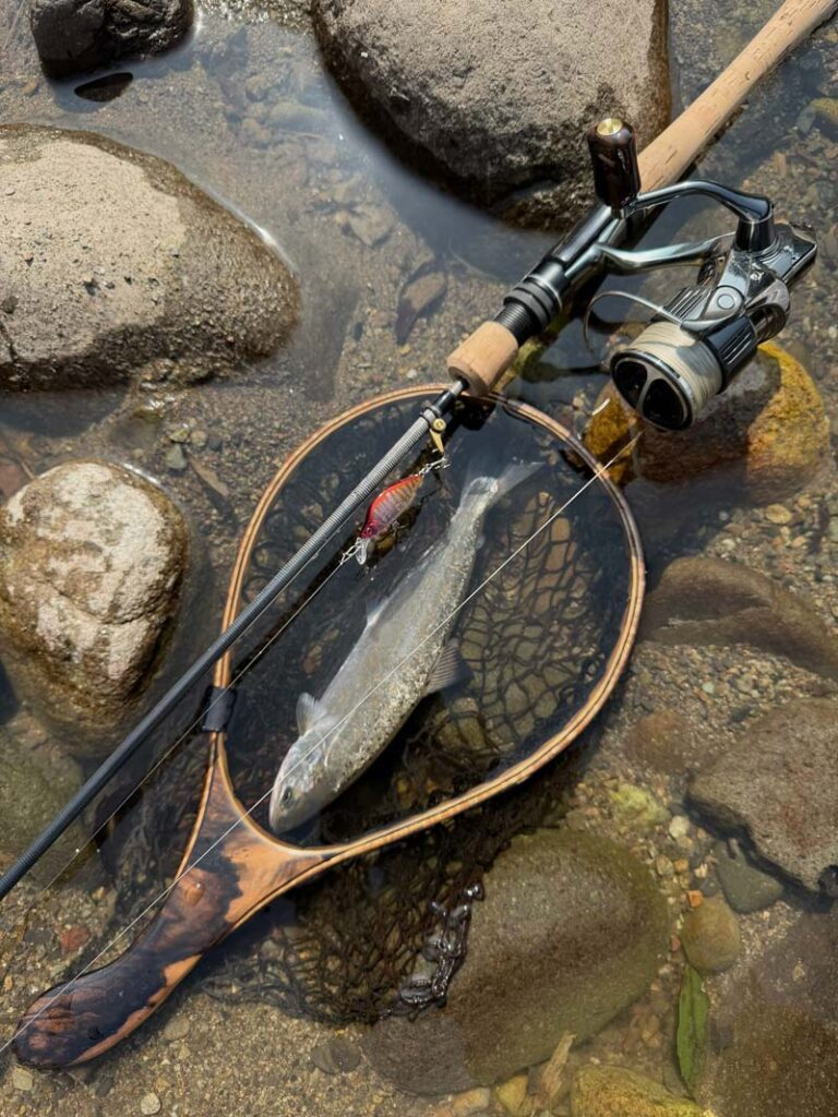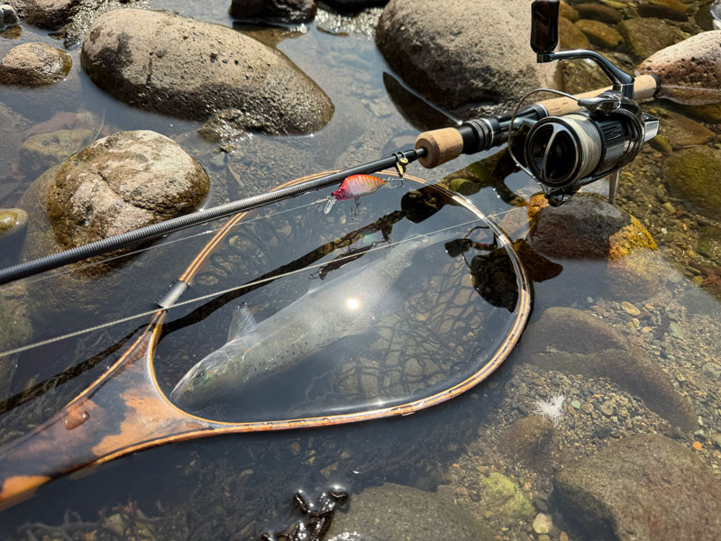銀毛の宝石と、右腕の確信流れの中で激しく抗う魚体をいなし、ネットに収まったのは美しい「本流アマゴ、本流シラメ」この一尾は何度経験しても色褪せることはない。
