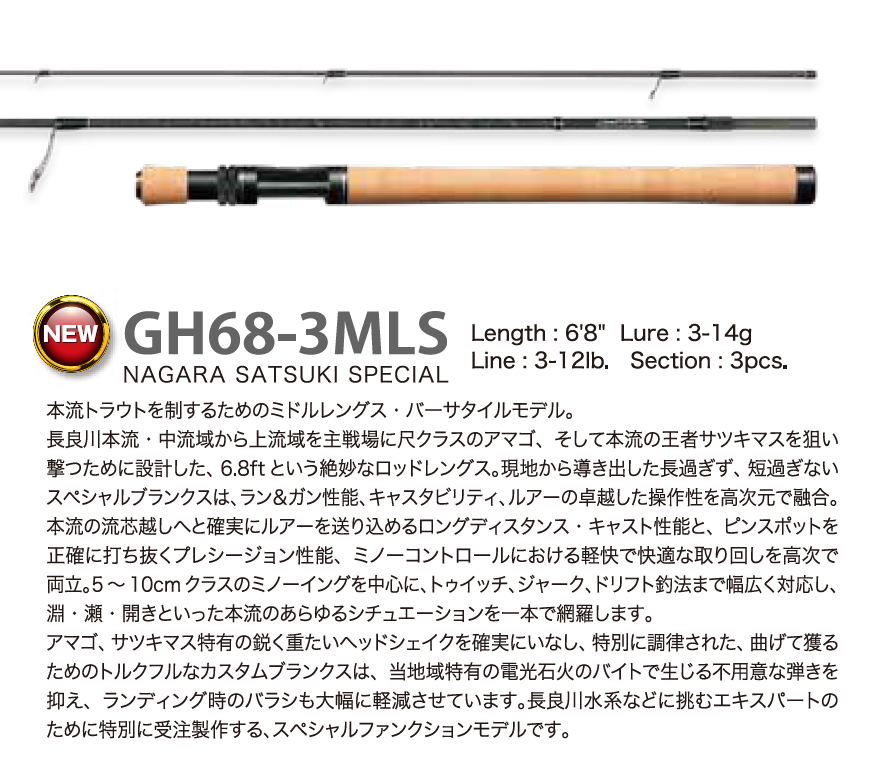 自分の右腕として、その暴威を完璧に制御したのは、今期GREAT HUNTINGよりリリースされる **『GH68-3 MLS NAGARA SATSUKI SPECIAL』** 長良川を制するための、必然のレングス「長過ぎず、短過ぎない」。