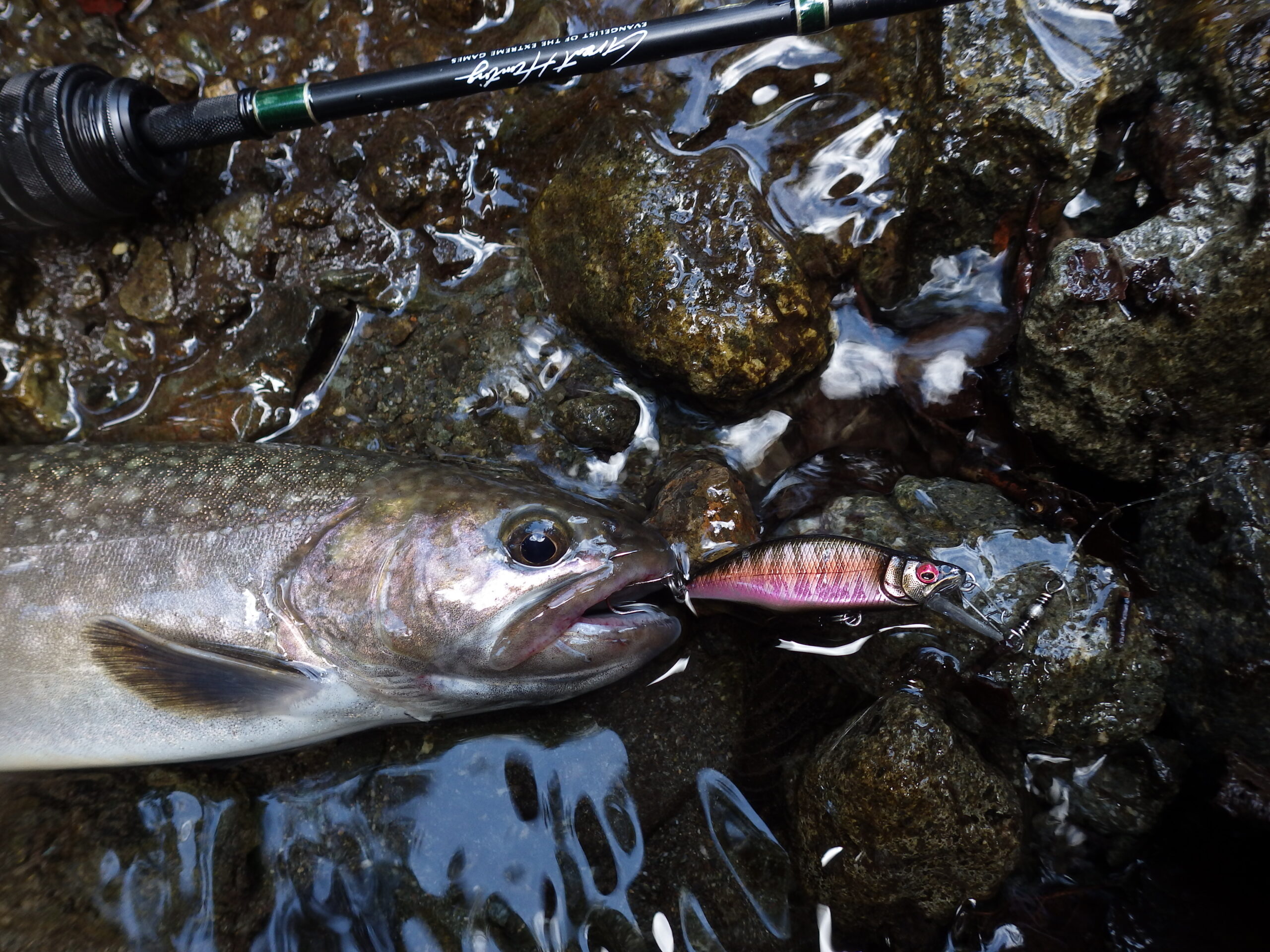 朱ピンクが滲み、黒くサビたような如何にもヤマメ・アマゴの婚姻色をデフォルメしたカラーでありまして、手の込んだ美しさに定評のあるメガバスのアートワークには珍しく、何処か地味でスパルタンな雰囲気漂う異質さがあります。