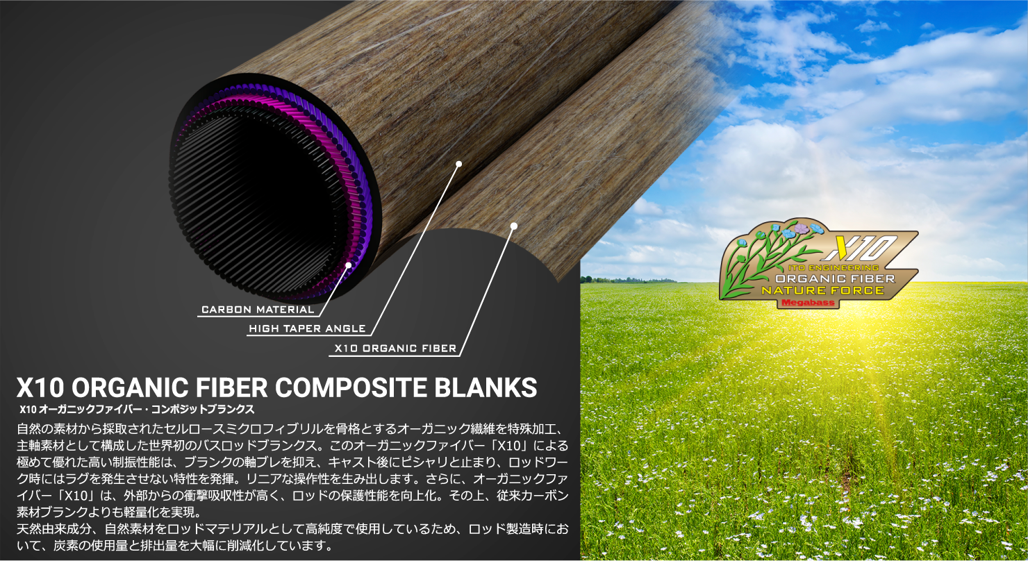 自然の素材から採取されたセルロースミクロフィブリルを骨格とするオーガニック繊維を特殊加工、主軸素材として構成した世界初のバスロッドブランクス。このオーガニックファイバー「X10」による極めて優れた高い制振性能は、ブランクの軸ブレを抑え、キャスト後にピシャリと止まり、ロッドワーク時にはラグを発生させない特性を発揮。リニアな操作性を生み出します。さらに、オーガニックファイバー「X10」は、外部からの衝撃吸収性が高く、ロッドの保護性能を向上化。その上、従来カーボン素材ブランクよりも軽量化を実現。