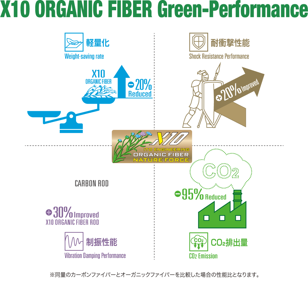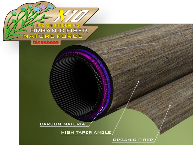 自然の素材から採取されたセルロースミクロフィブリルを骨格とするオーガニック繊維を特殊加工、主軸素材として構成した世界初のバスロッドブランクス。このオーガニックファイバー「X10」による極めて優れた高い制振性能は、ブランクの軸ブレを抑え、キャスト後にピシャリと止まり、ロッドワーク時にはラグを発生させない特性を発揮。リニアな操作性を生み出します。さらに、オーガニックファイバー「X10」は、外部からの衝撃吸収性が高く、ロッドの保護性能を向上化。その上、従来カーボン素材ブランクよりも軽量化を実現。
