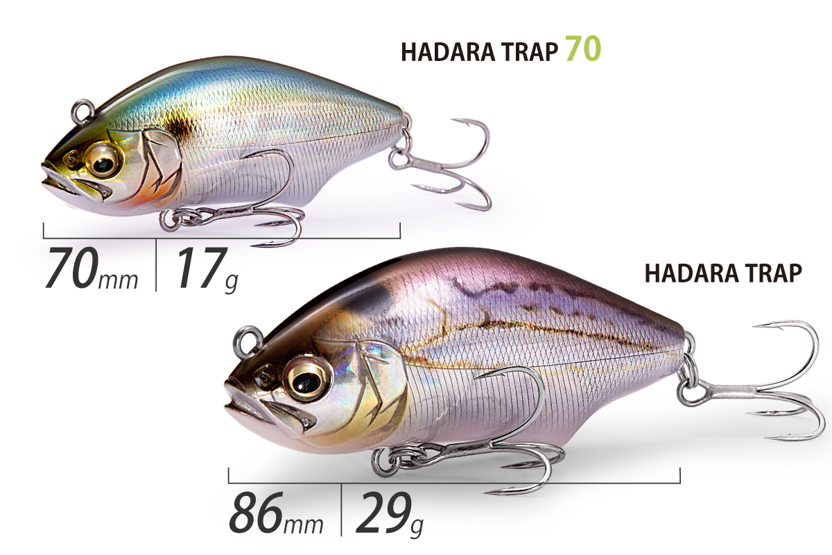 ハダラトラップ70はニューコンセプト・トリックベイト。アクションは、フラッシングを伴うハイピッチロールドライブを基調とし、オートマチックに左右への千鳥ダートが入る複合エスケープアクション。あらゆるルアーを見切った百戦錬磨のボイルの主や、食い気の無いニュートラルフィッシュも思わず口を使ってしまう、フィッシュイーターの本能に訴える脱軌道逃走アクションを披露。