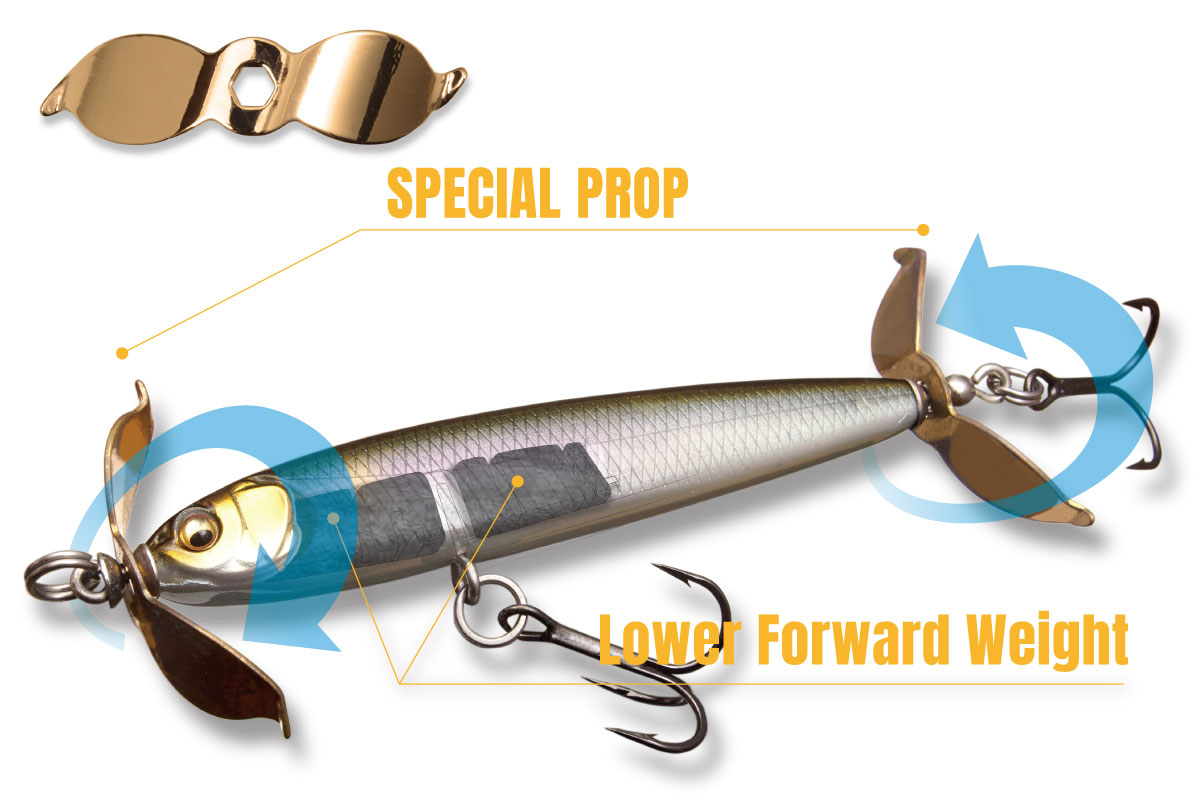 特殊形状・前後逆回転の大型プロップを採用し、ヘビーウェイトでも安定したスイム姿勢とレンジキープが可能。プロップの生み出す波動とフラッシングで広範囲にアピールします。